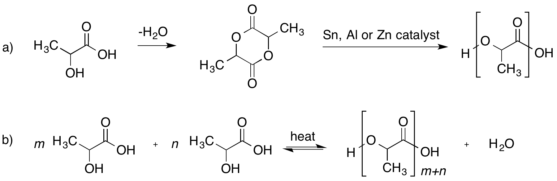 利用乳酸合成聚酯的途径示例。a) 乳酸缩合为二聚丙交酯,然后进行开环聚合生成聚乳酸;b) 乳酸直接缩合,表明需要不断地从体系中除去水以推动反应进行