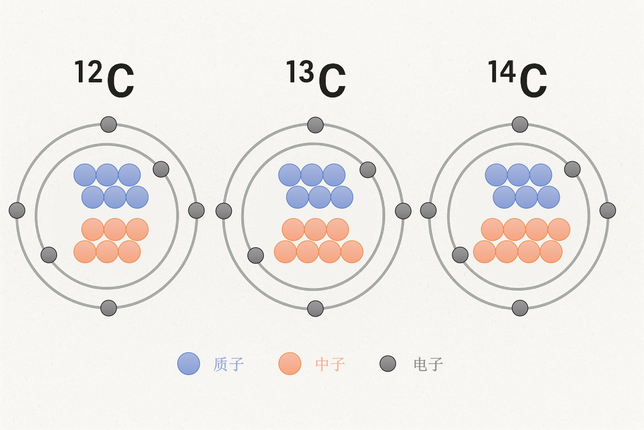碳-14 (¹⁴C):6个质子,8个中子,痕量,具有放射性;