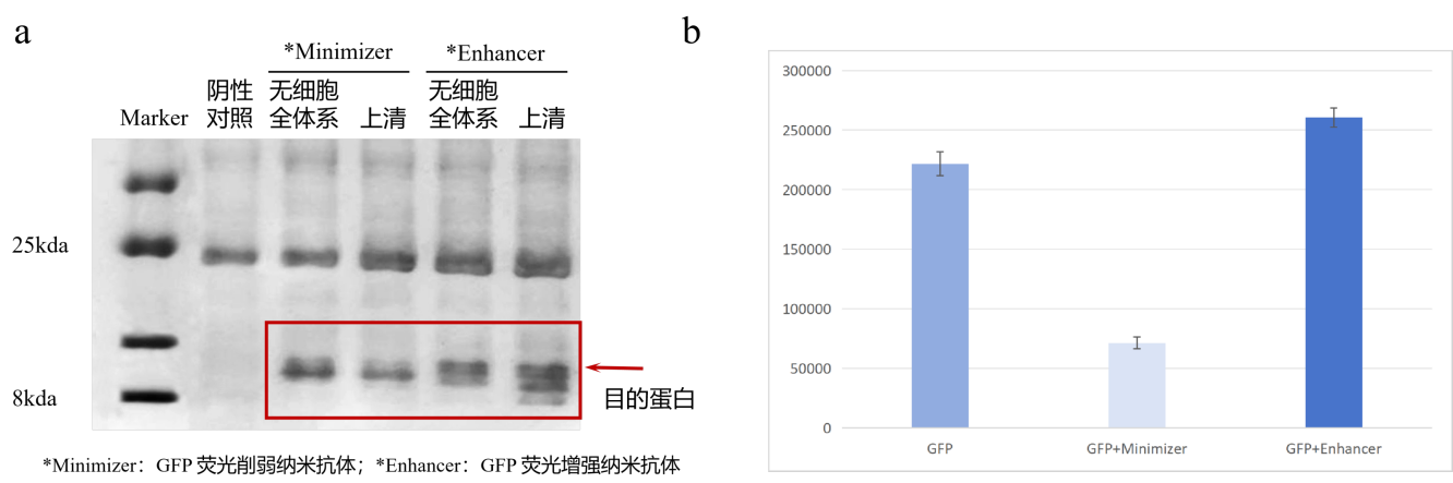 两种GFP纳米抗体(Enhancer与Minimizer)经无细胞表达体系的可溶性表达后,所得重组蛋白均可与绿色荧光蛋白(GFP)特异性结合,且能稳定发挥其荧光增强或荧光抑制的生物学功能。