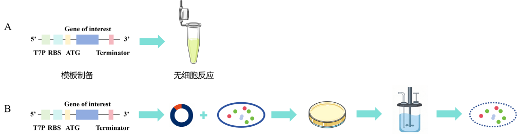 无细胞蛋白表达根据模板类型分为以DNA为模板的转录—翻译模式和以mRNA为模板的直接翻译模式,其中DNA为模板是目前最常用的模式,反应过程与细胞内一致且同步进行。